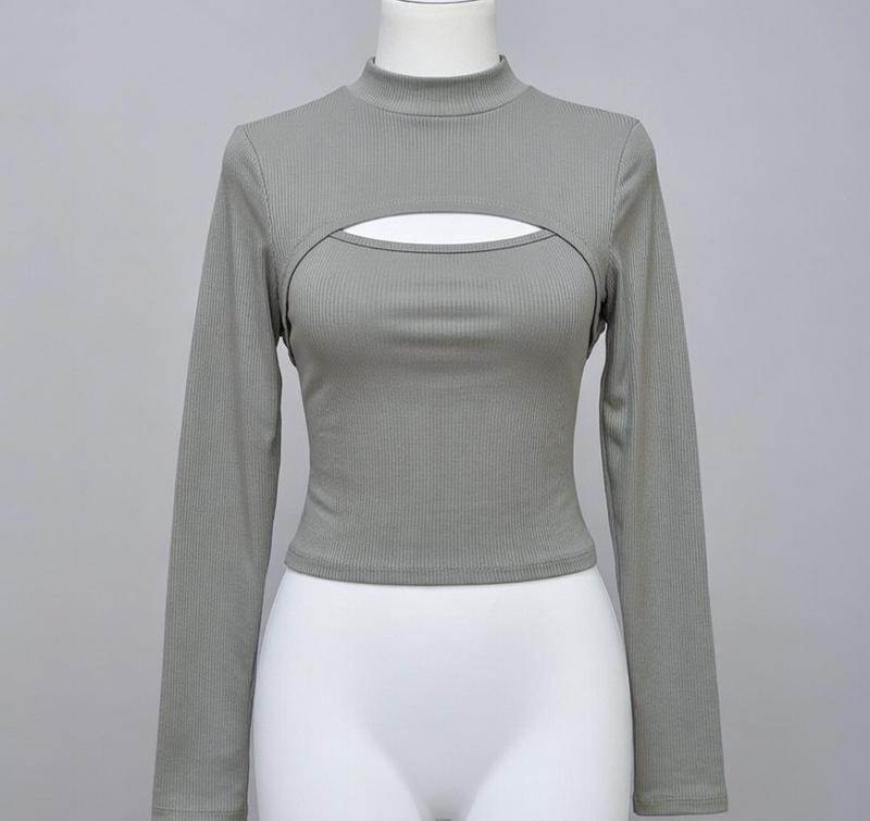 На фотографії представлена жіноча кофта з довгим рукавом (лонгслів) в рубчик, виконана в оливковому кольорі. Особливістю моделі є декоративний горизонтальний виріз у формі «краплі» на грудях та комір-стійка Модель поєднує в собі елементи базового гардеробу та трендові деталі, підходячи як для повсякденних образів із джинсами, так і для більш ошатних поєднань зі спідницями.