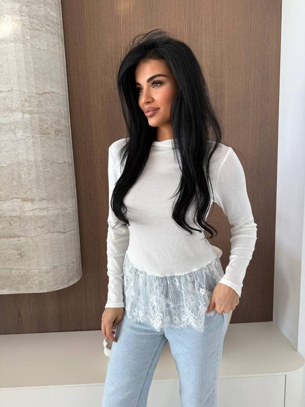 Лонгслив с кружевом Модель 958 Размер: 42/46 48/52 Ткань: трикотаж Ойшо Турция 🇹🇷 и французское кружево (дизайн может меняться) Идеальная ткань, максимально приятная к телу, имеет высокий коэффициент растяжения, поэтому идеально садится по телу. Красиво стирается, не теряет цвет и форму Элегантный лонгслив с кружевной баской Утонченная модель, сочетающая в себе лаконичность повседневного стиля и романтические акценты. Эта кофта станет главным украшением вашего образа, добавляя ему женственности и шарма. Универсальность: Идеально комбинируется с джинсами (как на фото), классическими брюками или юбками-карандаш. Цвет: черный и белый амур) Идеальное качество и дизайн