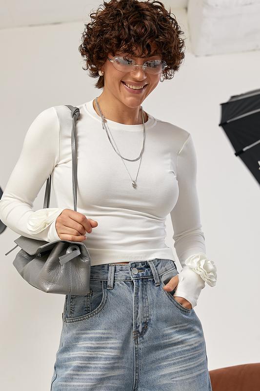 ЗАМІРИ ВИРОБУ Довжина переду виробу, см 49см Довжина рукава від горловини, см 72см Ширина під проймами рукавів (над грудьми), см 38см Довжина рукава по внутрішньому шву, см 53см РОЗМІРНА СІТКА ХАРАКТЕРИСТИКА ТОВАРУ Країна Китай Тканина Трикотаж Склад тканини 100% бавовна Параметри моделі 86*60*92 зріст 173 Розмір на фото ONE SIZE ОПИС АРТ. 136900 Однотонний лонг із трояндами на рукавах — жіночна та водночас стильна модель із виразним акцентом. Приталений крій красиво підкреслює силует, а еластичний трикотаж м’яко прилягає до тіла, добре тягнеться та забезпечує комфорт упродовж дня. Кругла горловина додає лаконічності, а прямий низ виглядає акуратно й універсально. Особливу увагу привертають рукави з отвором для пальчика — практична деталь, що додає трендового настрою. Зверху над долонею розміщена декоративна троянда, яка створює ніжний акцент і робить модель більш оригінальною та впізнаваною. Лонг чудово поєднується з джинсами, спідницями або класичними штанами, а також гармонійно виглядає в поєднанні з жакетом чи кардиганом для стильних повсякденних образів.