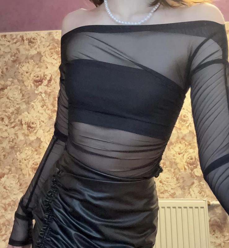напівпрозорий лонгслів зі спущеними плечима йде в комплекті з топом