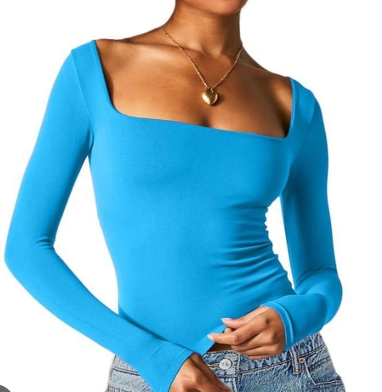 женский облегающий лонгслив (или топ с длинным рукавом) ярко-голубого цвета с характерным квадратным вырезом (каре). Особенности модели: Дизайн: Однотонный топ приталенного кроя (Slim Fit), подчеркивающий фигуру. Материал: Часто такие модели изготавливаются из эластичного трикотажа, вискозы или полиэстера с добавлением эластана для плотной посадки. Стиль: Базовая вещь, подходящая для повседневных образов, хорошо сочетается с джинсами, брюками