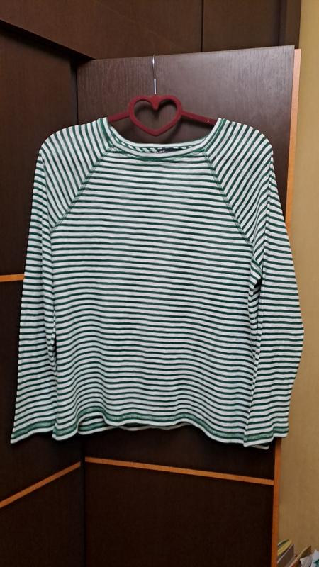 лонгслив в зелено-белую полоску, очень классный по качеству, в идеале, длина 57, ширина под руками 51, рукав от горловины 64.