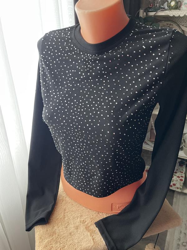 Красивий лонг ( в реалі чорніший) телефон не передав колір, стрази всі на місці, лонг в рубчик щільний не як майка.