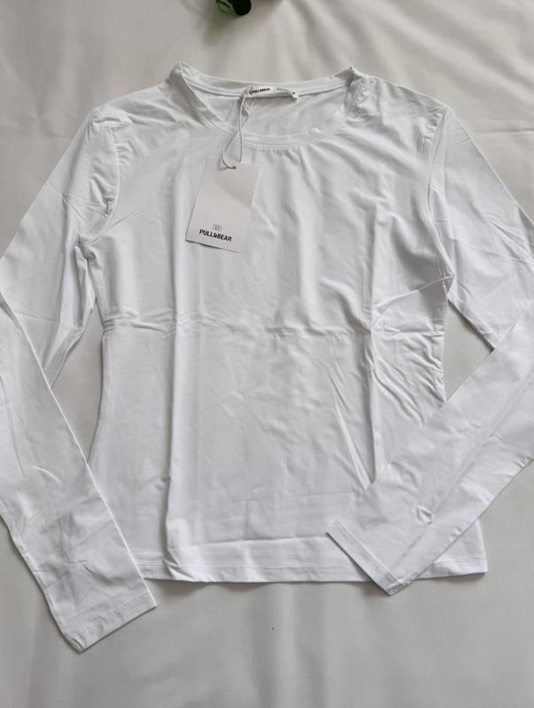 Білосніжний лонгслів від Pull&Bear, новий, з біркою, тканина поліамід, лягає, як друга шкіра, класно доповнить образи з джинсами чи брюками. Розмір М.