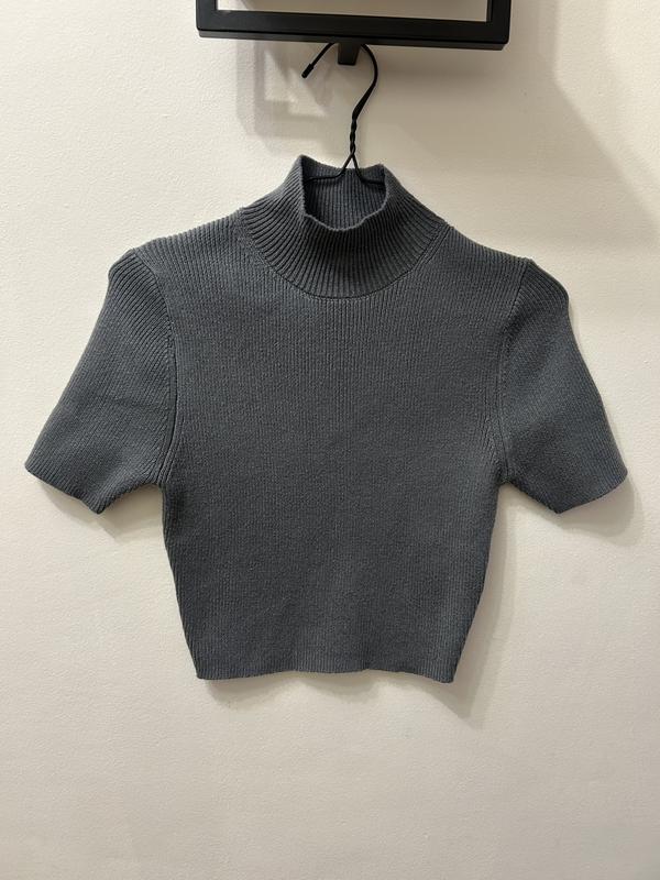 трикотажний кроп-топ у рубчик від бренду Zara. Модель вирізняється високим коміром (напівгольф) та короткими рукавами.