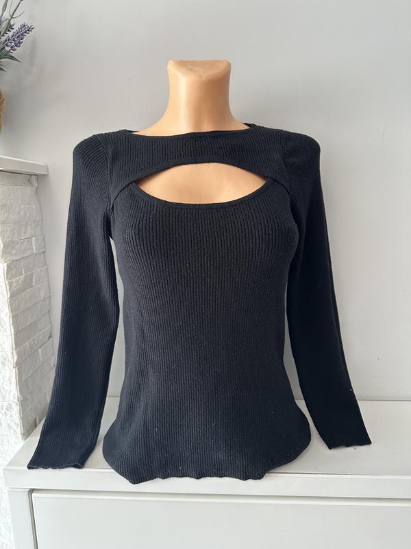 чорний лонгслів у рубчик з оригінальним вирізом над зоною декольте та довгими рукавами. Р.14,довжина48,пог49 Тянеться добре