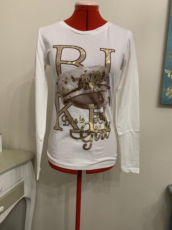 Удобная белая кофта с ярким золотым принтом. Длина изделия 61 см, длина рукава 62 см.