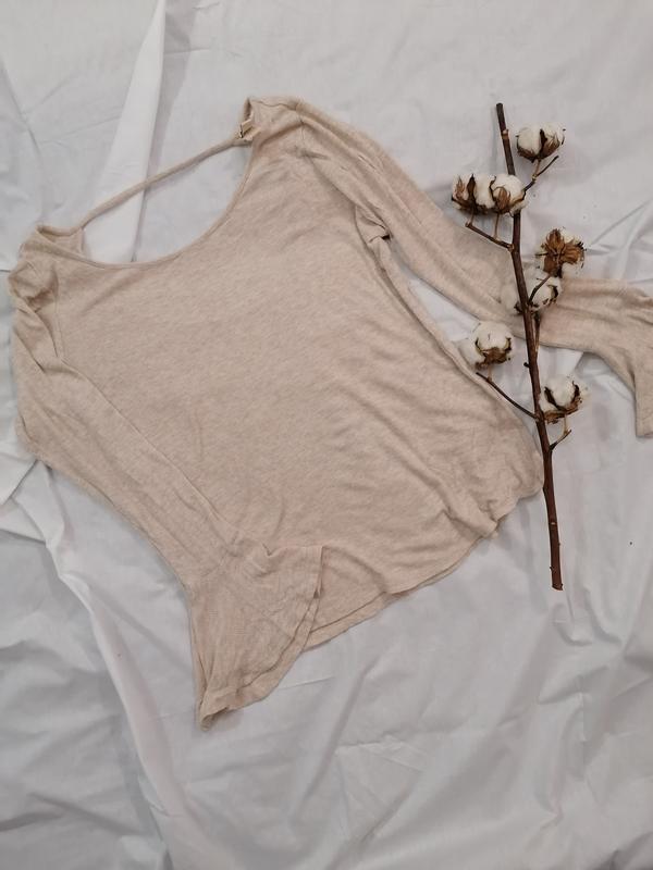 Нежный трикотажный лонгслив в рубчик с воланами на рукавах и глубоким вырезом по спинке. Длина изделия - 57см ПОГ - 42см