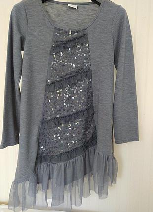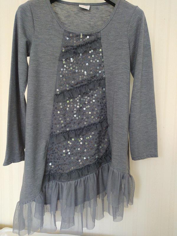 Туничка на подростка или худенькую девушку. Сверяйте замеры !! Цвет, как на фото , где ткань темнее. Пайетки все на месте. Следы носки минимальные. ПОГ-39 ПОТ-42 ПОБ-46 Длина с оборкой -65 спереди, 74-сзади Д рукава-46 ПО Бицепс-12-15 Ширина плечей-33
