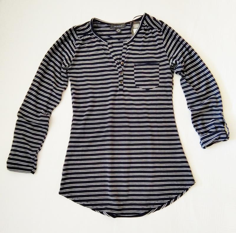 Стильный лонгслив Primark в полоску. Рукава подворачиваются и фиксируются пуговичкой, на груди карман, треугольный вырез застегивается на пуговицы. Низ закругленный. Цвет: синий + белые полосы. состав: полиэстер+вискоза Размер XS замеры: длина по спинке - 69 см под руками - 41 см+ длина рукава - 57 см пот - 36 см новый, с бирками