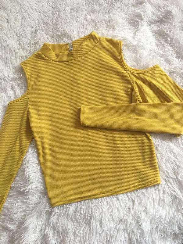 Гольф-топ в рубчик, с открытыми плечами желтого цвета; сзади на шее застёгивается на две пуговки. Бренд boohoo Размер - S-M Длина от горла - 46 см Длина рукава - 58 см ПОГ - 42 см (тянется) ПОТ - 38 см Мои параметры: Рост - 164 см ОГ - 94 см ОТ - 66 см ОБ - 96 см