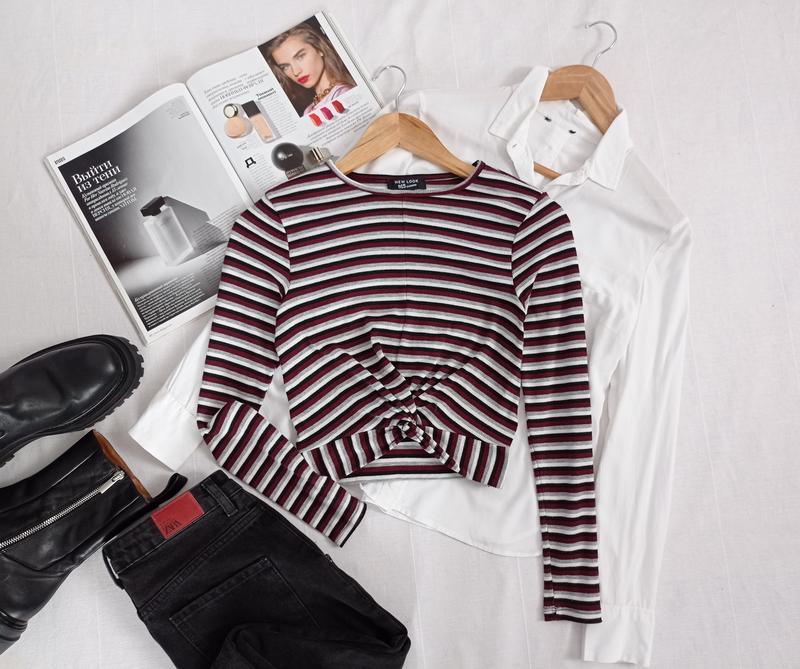 укорочений лонгслів в смужку від New Look з вузлом, тканина трикотаж рубчик, добре тягнеться, розмір S, З грудей 40 см тягнеться до 48 см, довжина 45 см, довжина рукава 60 см