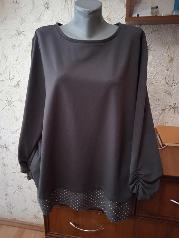 Размер на этикетке XL, смотрите замеры. Ткань средней плотности, немного тянется, 69% полиэстер, 28% вискоза, 3% эластан. Цвет темный серый. Внизу вставка 100% вискоза. Состояние очень хорошее, есть лёгкая, еле заметная кашлатость, не критично. Длина от верхней точки плеча к низу 73. Длина рукава от плечевого шва 54. П/о бицепса 18 тянется до 20. П/о груди 63 тянется до 66. П/о талии 64 тянется до 67. П/о внизу 67 не тянется. Ширина между плечевыми швами 45. 30.