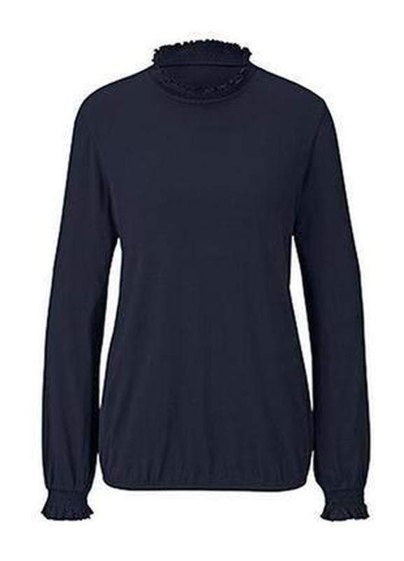 Синий вискозный гольф. По горловине и манжетам сборки. Низ на резинке. Нюанс: след от хранения , показала на фото. Указан размер 36-38. Пог - 50 см. Длина по середине спинки - 63,5, без учета сборок. Длина рукава -64 см. Сток.
