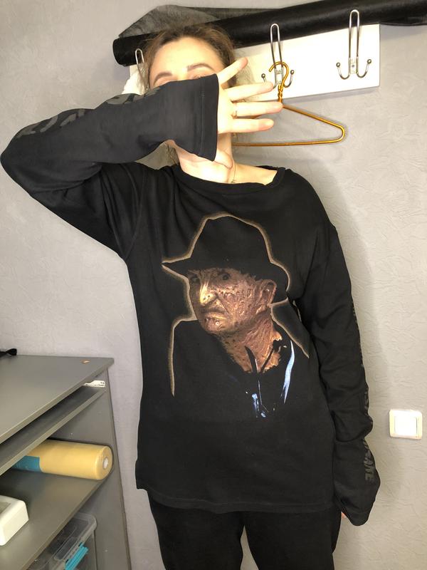Лонгслив для поклонников старых ужастиков. Фредди Крюгер идет за тобой)..Следы носки отсутствуют, не потертый и в отличном состоянии. Размер L, ширина плеч 60, длина рукава 66, длина 74, грудь 59