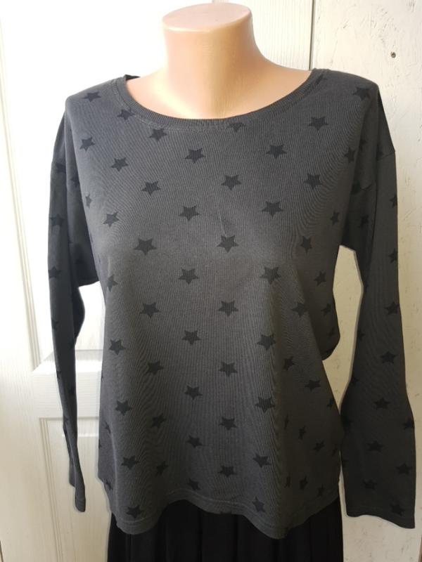 Темно серый, принт-звездочки, линия плеча спущена.Длина-58-63см,ПОГ-54см.Указан р-р S-L