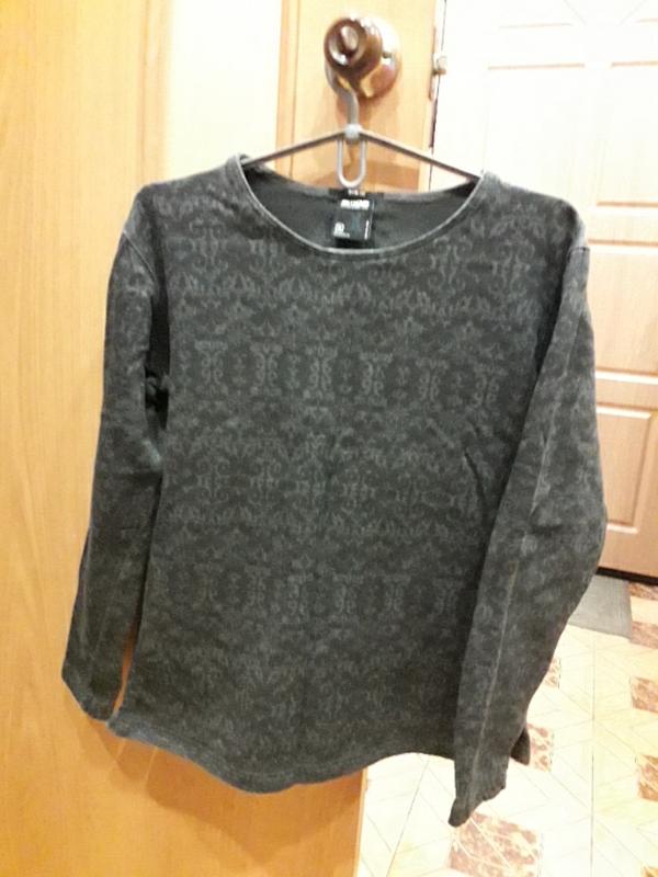 черный с серым принтом плотный коттон на весну и теплую осень, в идеале темнее чем на фото, отличное состояние ПОГ 55см Длина рукава 56.5см Длина 59см