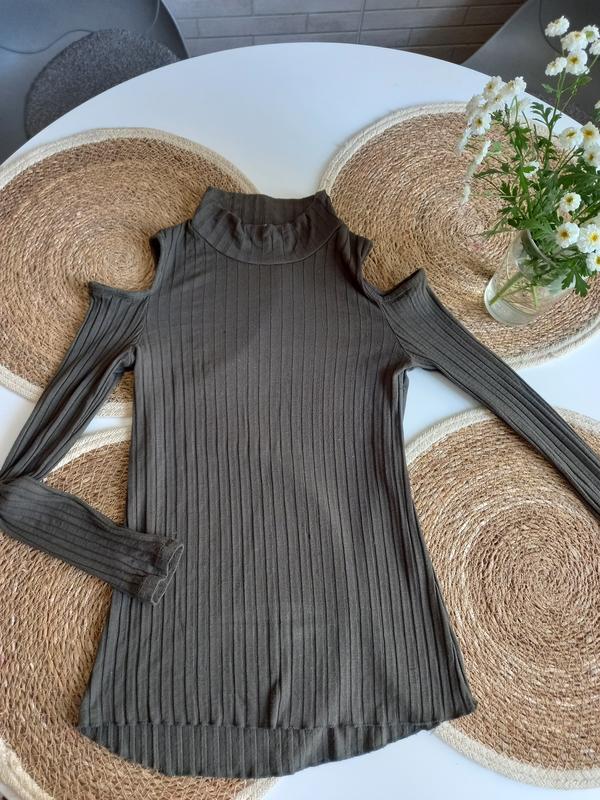 в рубчик,тягнеться. стан добрий,но на рукаві є зашите місце,і рару чорних цяточок. довж.56 см гр.34