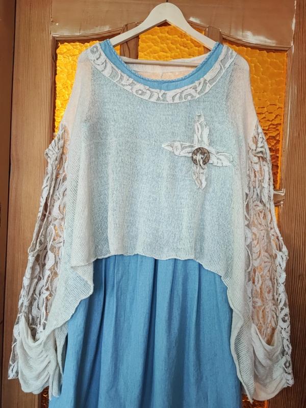 Оригинальная и очень красивая летняя накидка с открытым плечом. Смотрится очень эффектно и стильно. Украшена плотным кружевом и аппликацией. Состояние идеальное. Следы ношения отсутствуют. Дефектов нет.