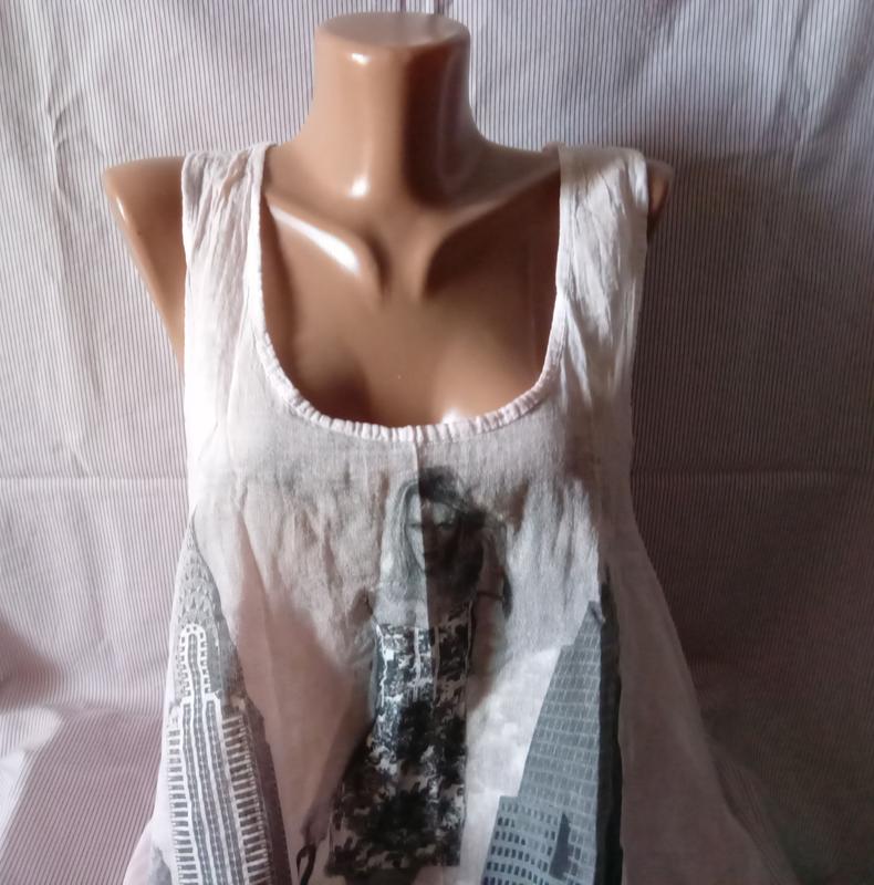 Натуральна,з сучасним принтом. З асиметричним низом по боках. ФОТО НА ТІЛІ НЕМАЄ. Довжина 56 Завширш(пахви) 60 Річ нова,без паперової бірки -СТОК.