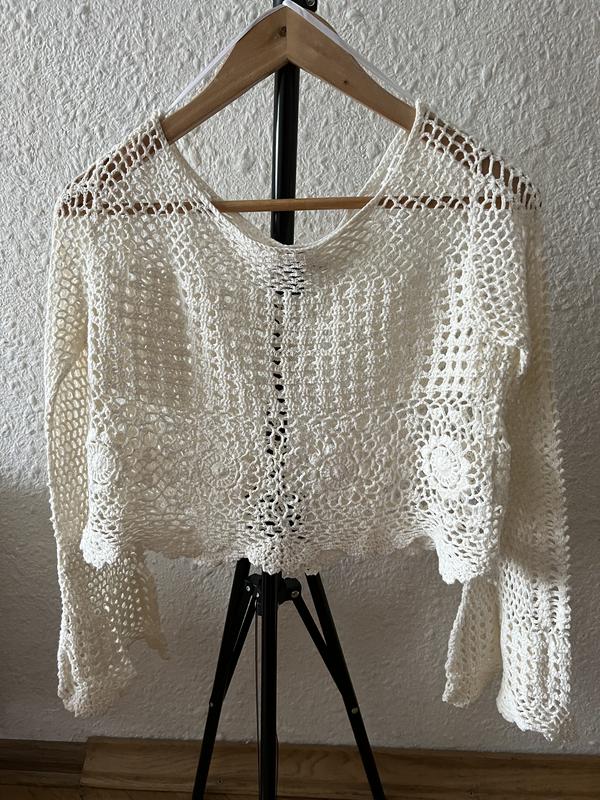 Очень красивый топ, красиво смотрится на теле, можна носить на одно плечо, расклешенные рукава, классно будет под сатиновую юбку или платье,или вообще под какой-то топ)