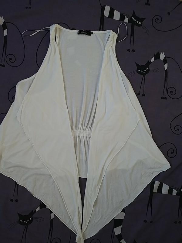 Жилет свободного асимметричного кроя без застежки.Ззади декоративная сборка, тканная стрейчевая.Как накидка подойдет и к размеру L.Новый, без бирки Длина по спине-53см