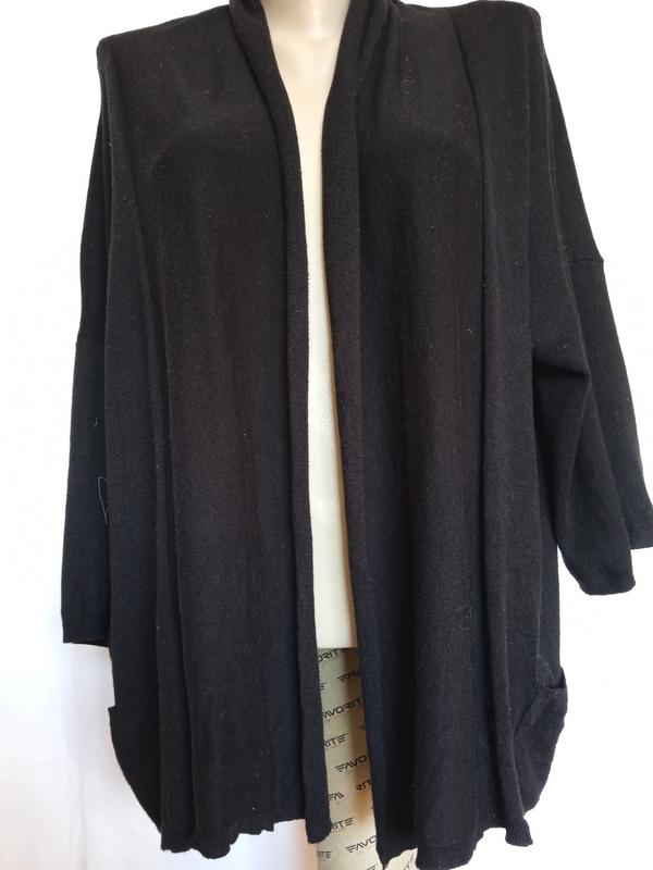 кардиган накидка гарна,колір насичений чорний,м'яка,приємна,є кишені,віскоза80%,добре тягнеться,крій вільний піде на багато розмірів,є кишені,рукав не вузький,довжина накидки70,пог,ширина між пахвами70,рукав від горловини73см,ширина по низу82,якісна річ без дефектів у відмінному стані