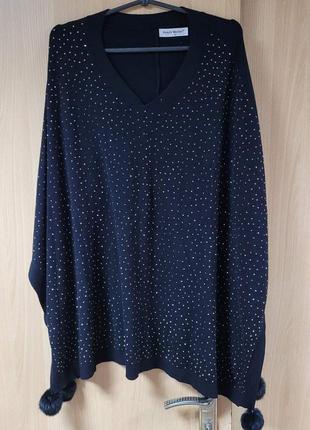 Красивая накидка с железными камешками, бубенчики из натурального меха. Черная. Новая,без бумажной этикетки. Ткань,как тонкий свитерок. Низ 2 по 84,, плечо от ворота 59, длина по спинке 75.