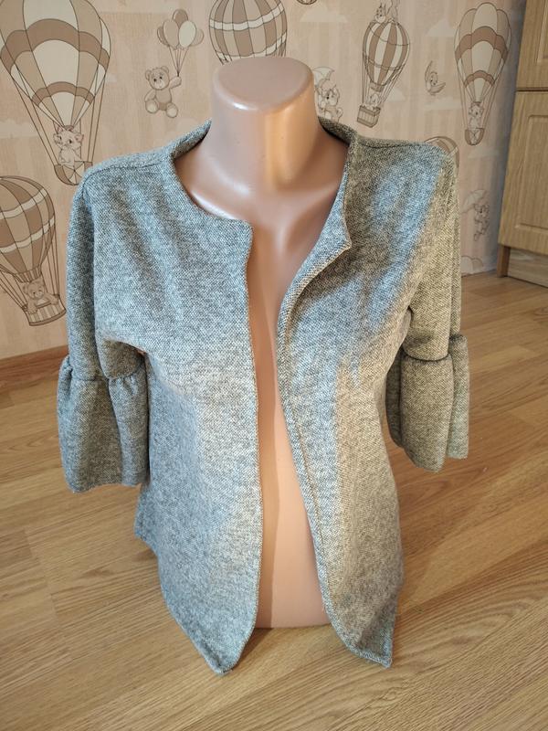 Интересная легкая кофта пиджака из приятной мягкой ткани. Красиво смотрится к платью и юбке. Интересный рукав 3/4. Размер М.