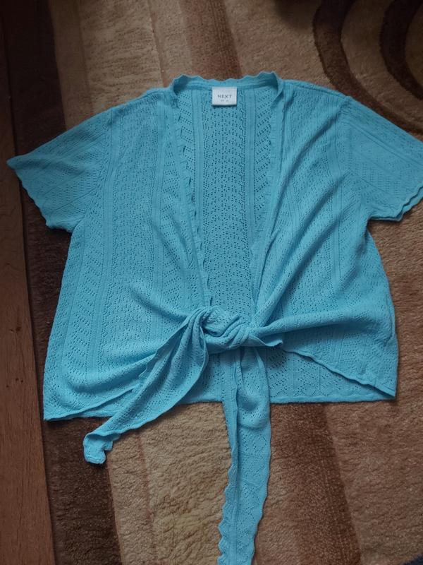 Очень приятная и нежная кофточка. Завязывать можно, как угодно. Цвет небесно голубой, не такой яркий, как на фото. Длина 52 см, длина рукава 16 см, ширина по спинке 52 см.
