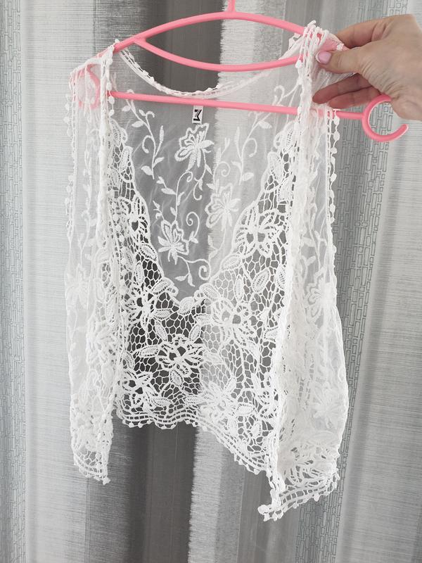 Классная нарядная летняя накидочка, дополнит образ. Можно на сарафан, вечернее платье, майку,футболку. Размер не указан, идёт где-то на S-L, так как без пуговиц.Прикольная, выглядит как накрахмаленная, держит форму.Оденена раз три. Цена символична.