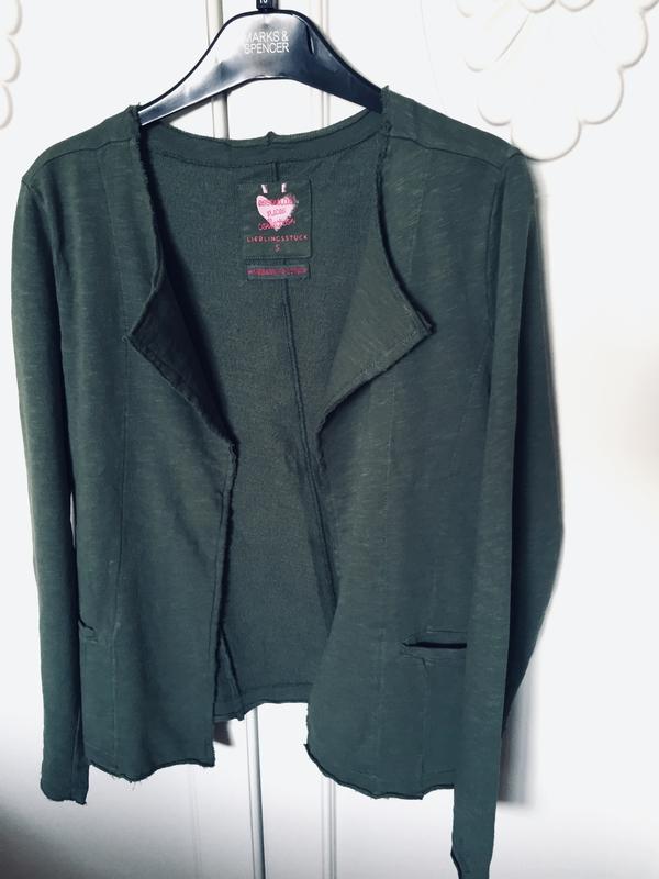 Очень приятный качественный трикотаж, состояние нового. В груди 50, по низу 48, рукав 59, длина 58. Попытки поймать цвет безуспешны, что-то среднее, болотно-зеленый приятный цвет.