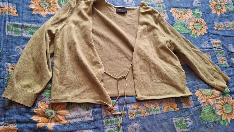 короткая кофта, накидка, рукав 3/4,на завязках зелёного цвета, замеры на фото