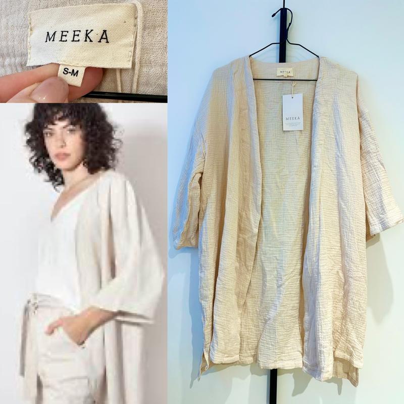 Класне стильне кімоно з органічної бавовни від Meeka. Якісний матеріал, приємний до тіла, гарний крій, модель іде без пояса. Розмір вказаний: S/ M, підійде і на L Колір: слонової кості
