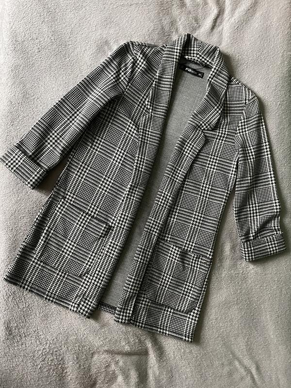 Классическая чернобелая длинная накидка изготовлена из легкого, но элегантного материала, имеющего хорошую драпировку. Она имеет прямой крой, что позволяет легко носить ее поверх разной одежды. Вырез на передней части накидки позволяет подчеркнуть силуэт, а длина по низу пояса придает образу элегантность. Она идеально подходит для вечерних выходов или для создания стильного повседневного лука.