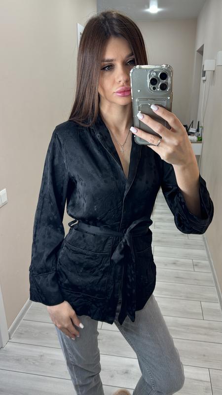 В наличии. Рубашка кимоно черная женская. Размер s. Длина 66 см Длина рукава 55 см Есть карманы. Застегивается на пуговицы, есть ремень который подчеркивает талию.