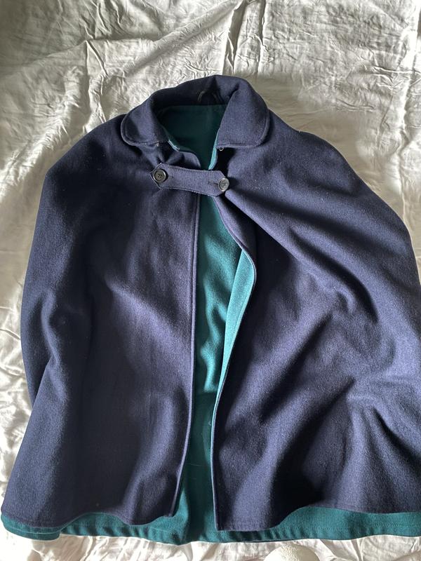 Накидка чорна з зеленою внутрішньою частиною. На застібці зверху. Важка і тепла тканина, добре носити, коли вітер