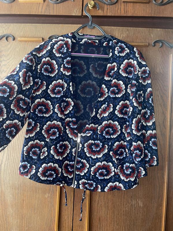 Легенька накидка з рукавом три чверті, та на стяжках знизу і на змійці, чудово виглядає під білу та червону майку, із прикрасами.