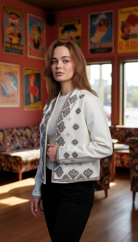 Піджак Модель 594 Піджак з вишивкою Застібки немає Розмір приблизно від 42 до 50( дивись заміри Колір білий та чорний Заміри: S ПОГ-53 см Довжина- 57 см Довжина рукава від горловини- 72см М ПОГ -55 см Довжина- 58 см Довжина рукава від горловини- 74 см L ПОГ -56 см Довжина-60 см Довжина рукава від горловини- 77 см Похибка вимірювання +~1см
