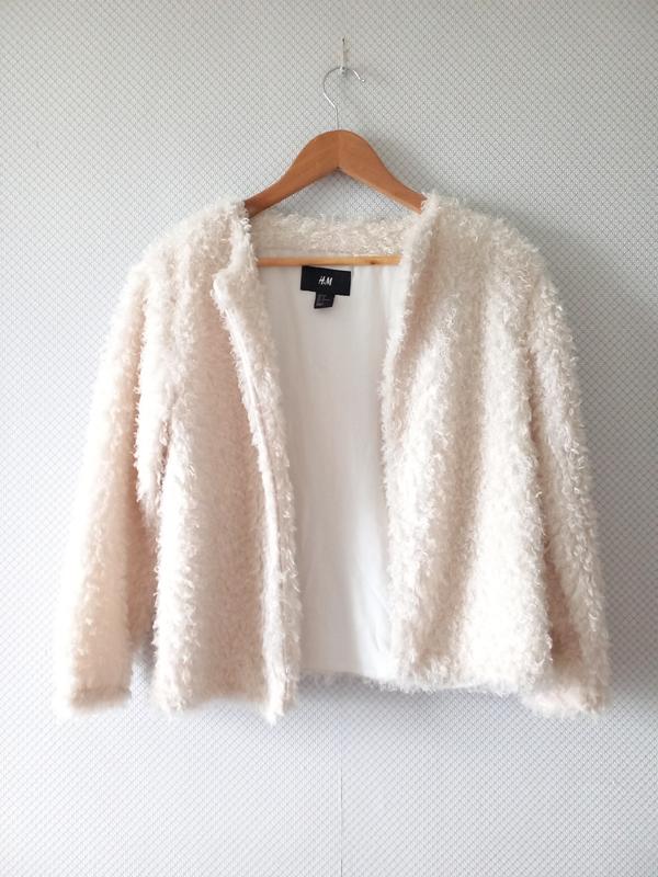 Сливочного цвета накидка, кардиган, жакет без застежки. Мех мягкий, шелковистый, похожий на барашек. Имеет частично подкладу, кроме рукавов. Стан идеален. Размер по набору 38. Замеры: под руками - 46см, рукав - 49,5см, длина по спинке - 52см.