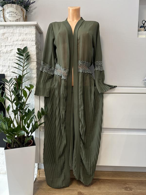 Сьильна довга плісирована накидка кольору хакі з мереживними вставками. Р.л-хл Довжина 130,Пог 54