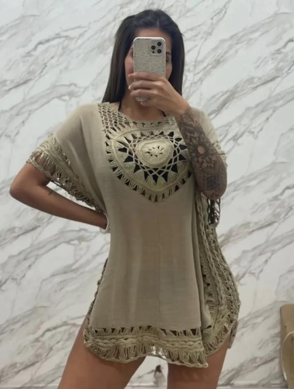 Цветуники9 (1 фото)Женская пляжная накидка с элементами(кроше).Стиль ручной вязаный крючок.Маленький БРАК(затяжка) последнее фото.Довжина 61см.Пог 75см