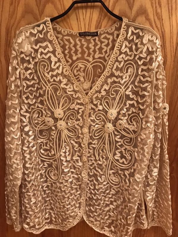 Нарядная,ажурная и красивая накидка фирмы YILIBEIER.Без дефектов,очень шикарная и гламурная.Дополнение к разной одежде,цвет -беж.Указан размер ХХЛ,но маломерит,если закрывать на пуговицы.В наличии идёт 3 пуговицы (2 одинаковых,и одна красивая тоже-другая) 🌼🌼🌼🌼🌼🌼🌼🌼🌼✳️🌼🌼🌼🌼🌼 Замеры Рукав 59 Плечи 48 Пог 58 Пот 54 Поб 60 Длинна 60