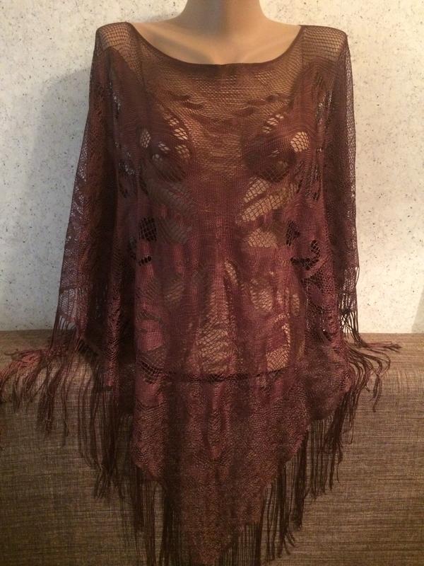 Ажурная накидка для праздничной и сценической одежды. Сложенная вдвое накидка трансформируется в платок. Длина кистей 20см. Цвет средне коричневый и фото точно передает цвет