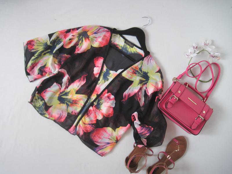 Шифоновая накидка черное кимоно в цветочный принт