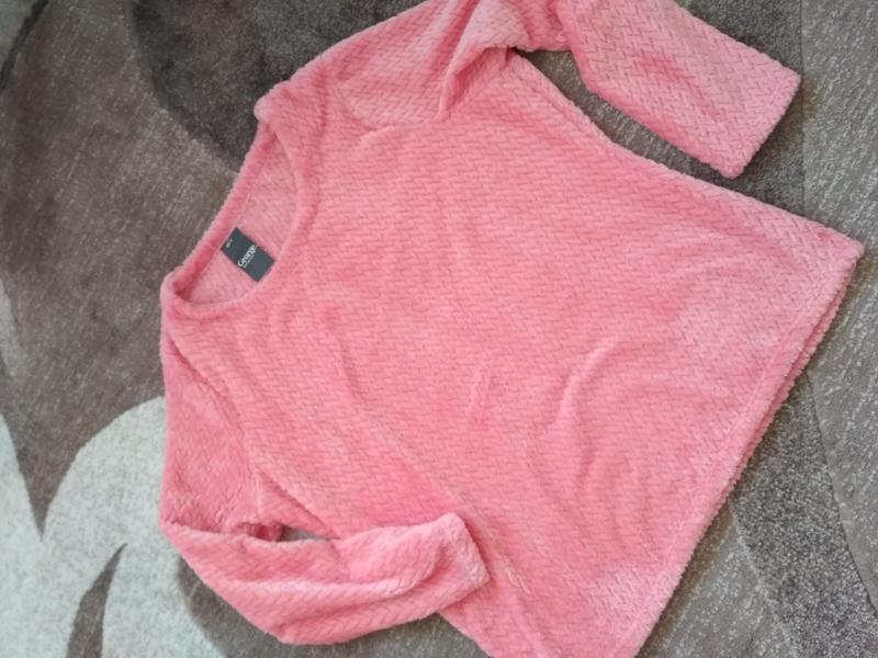 Кофта дуже м'яка, не кошлатиться), тканина не мнеться, приємне плюшеве волокно))) мало тягнеться ПОГ 63 Пот 62 Довжина 70