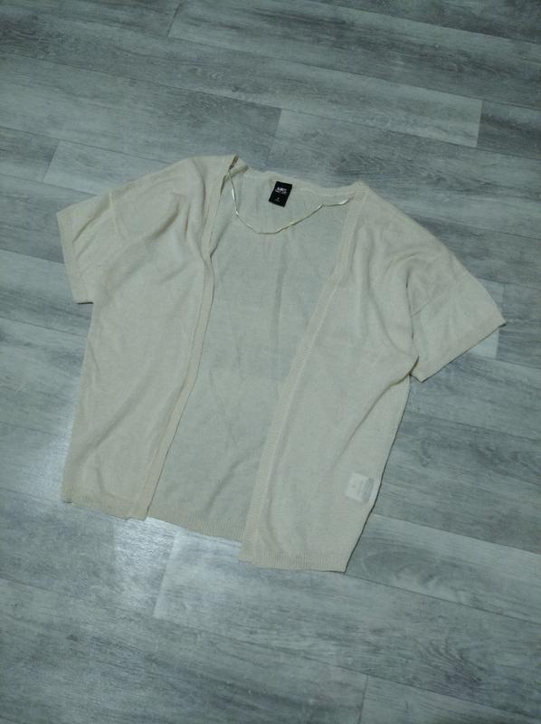 Накидка/кардиган лёгкая бежевая. Замеры: плечи 57 см, длина по спине 53 см, рукав 9 см, пог 49 см.