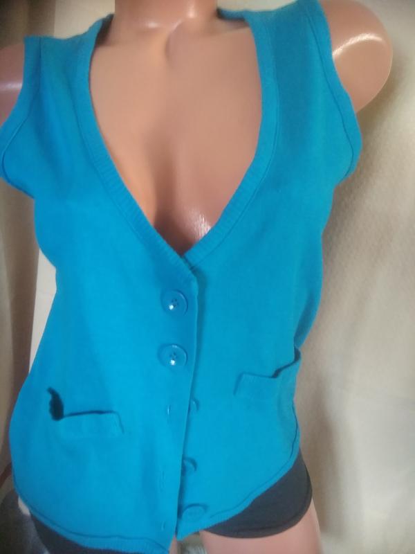 Гарний бірюзовий жилет, наживо колір гарніший ПОГ 45-50 см ПОТ 40-45 см Довжина 51 см Прохання перед замовленням уточняти деталі. Відправка тільки Укрпоштою!!! З безпечною оплатою не працюю, бо немає технічної можливості