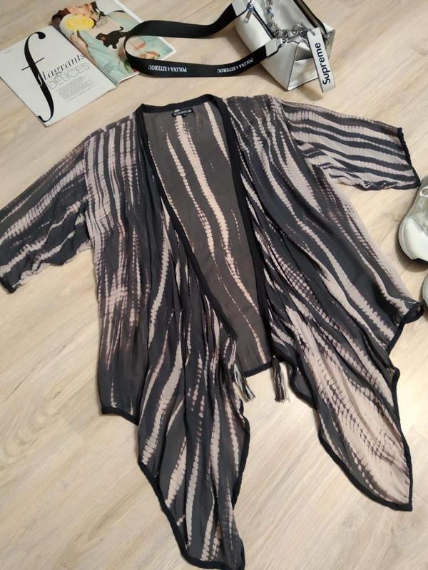 в отличном состоянии без дефектов и изъянов хорошо сидит по фигуре станет незаменимой вещью весной и летом очень качественная ткань и отделка ткань тонкая просвечивается, мягкая, приятная на ощупь и к телу, можно носить,как пляжную накидку или поверх одежды, цвета дымчатые, следы носки минимальны кому подойдёт не пожалеете прослужит вам долгие годы хорошо сочетается с любыми вещами и аксессуарами фото на теле нет, силуэт прямой оверсайз, спереди полочки на удлинение,можно завязать,на концах кисточки, рукава кимоно 3/4,,приспущен,без застёжки,без карманов,бирку с брэндом и составом забыла добавить,кому важно,я скину состав Вискоза длина изделия сзади 73, спереди 103 рукава от горловины 50,от плеча 33 Поб 62 Пог 62 очень качественная и крутая вещь замеры точные
