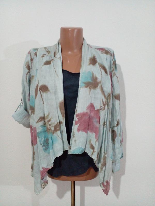 Плечі-41 Пог-50( по спині) Рукав-60( повна довжина) Довжина-50-70( хвостики) Не застібається Ідеально зверху однотонної лляної сукні